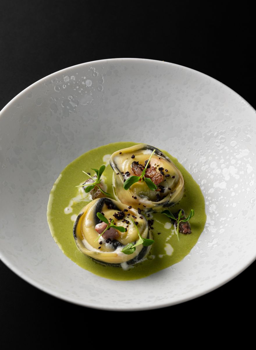 Les primi affirment le cœur de la cuisine italienne : un Risotto cime di rapa e muddica atturrata, riz Acquerello, cime di rapa et chapelure à la sicilienne, d’une précision remarquable ; des Ravioli mbuttunati au poivron, Gambero Rosso de Mazara et sabayon au Marsala, tout en finesse et en gourmandise ; et les Tagliolini di Campofilone, au beurre fumé et à la truffe noire Melanosporum, plat signature d’une élégance absolue.