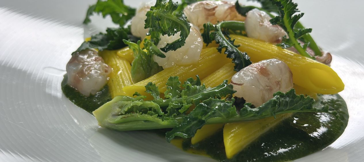 Penne mezzani rigate di Gragnano allo zafferano, mazzancolle e broccolo fiolaro di Creazzo