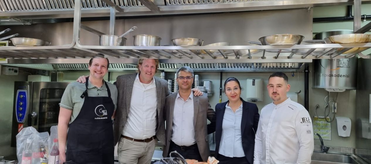HRC International heeft de dagen goed volgepland, en na het ontbijt vroeg in de morgen staat de taxi al klaar voor het bezoek aan Chef Table, een culinary instituut in Istanbul. 12 met een bachelor degree afgestudeerde culinary talenten staan klaar bij de Demo keuken van Chef’s Table waar Arjan en Daniel hun signature dish zullen tentoonstellen. Na een uitgebreide demo is het dan tijd voor de studenten om de messen, potten en pannen te pakken en de signature dish van Daniel na te maken. Daniel en Arjan lopen nauwlettend rond, af toe even proeven, een kleine tip hier en daar, en dan is het zover; de gerechten zijn af.