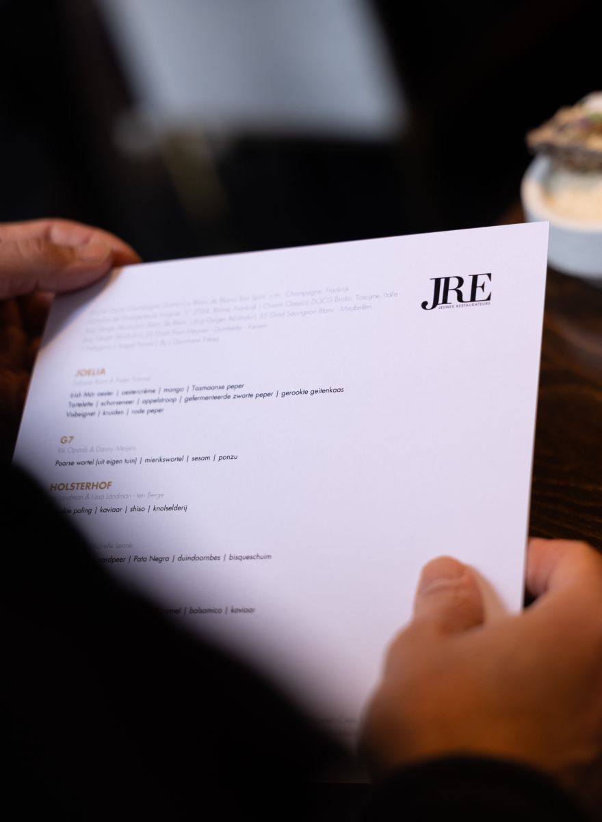 De lunch werd verzorgd door de nieuwe JRE-leden, samen met de gastheren van de middag: JRE-chef Sofiane Bons en maître Pieter Timmer van Restaurant Joelia. Bons werd in februari door Gault&Millau uitgeroepen tot Jonge Chef van het Jaar 2026.