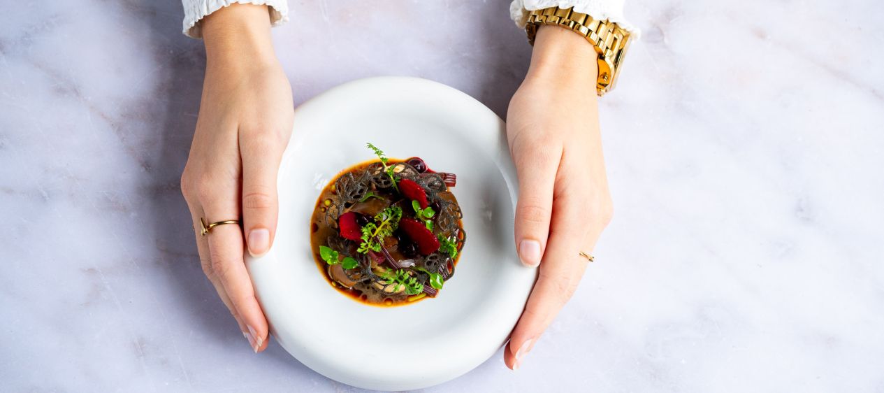 “Omdat we een verspillende sector zijn, gebruik ik zoveel mogelijk van het product in mijn gerechten. We serveren dus niet alleen kaviaar, maar ook de steur. En van de aardpeer telen we niet alleen de knol, maar koken we ook honing van de bloesem. Op die manier kunnen we een beetje teruggeven van wat we nemen. Ik hoop dat jullie genieten van de gerechten, maar bovenal van elkaar!”
