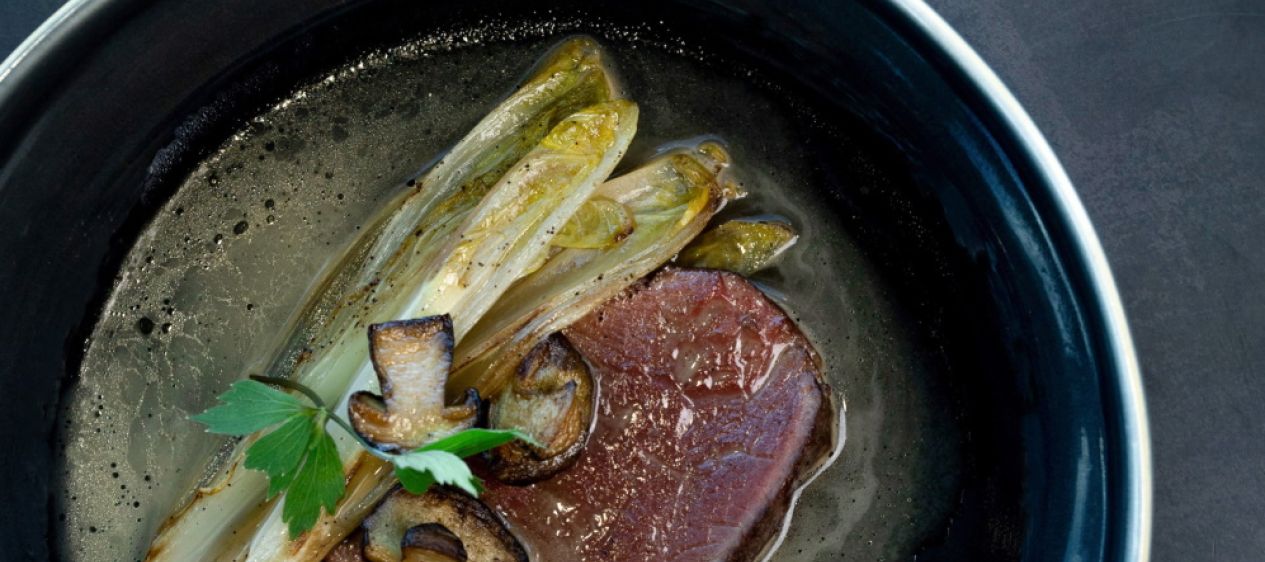 Serveer het vlees met de gebakken witlof, paddenstoelen en de jus van het hert.