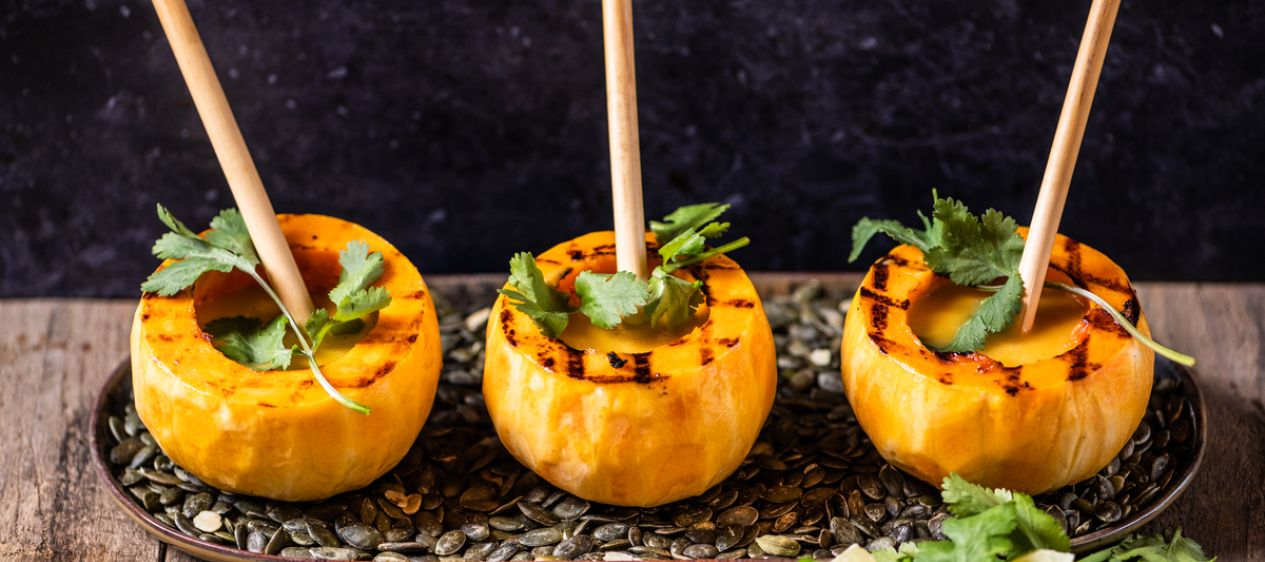 Elke chef van de Jeunes Restaurateurs die in zijn keuken de beschikking heeft over een Big Green Egg steekt de houtskool elke dag aan, het hele jaar door. Smaak is tenslotte niet gebonden aan een jaargetijde. Dus ook thuis nu de buitentemperatuur weer is gedaald steek jij natuurlijk gewoon de houtskool in je Big Green Egg aan, want buitenkoken in je Big Green Egg kan het hele jaar door. Deze heerlijke Oosterse pompoensoep past perfect bij het seizoen van dit moment. Je kunt de soep van tevoren maken, zodat hij klaar staat als je thuiskomt en je de soep alleen nog maar op hoeft te warmen. Nodig je vrienden uit? Laat ze dan kennismaken met jouw cooking skills, de bereiding van de soep duurt niet lang. Doordat je de pompoen eerst op het gietijzeren rooster grilt krijgt de soep nog meer smaak.