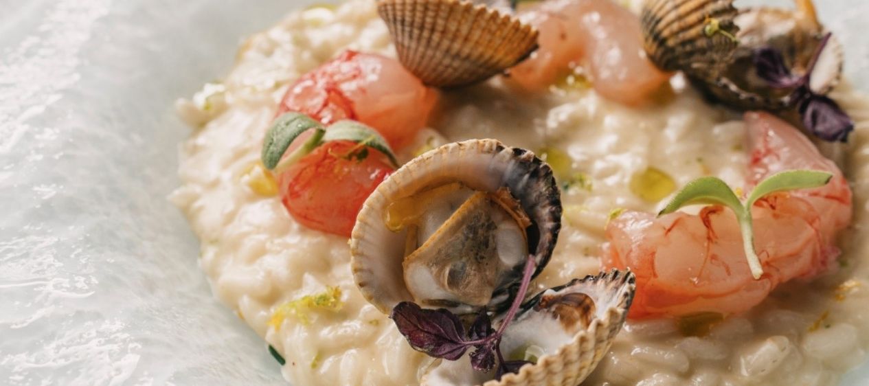 Riso acquerello met mediterrane smaken, yoghurt, kokkels en Mazara gambas