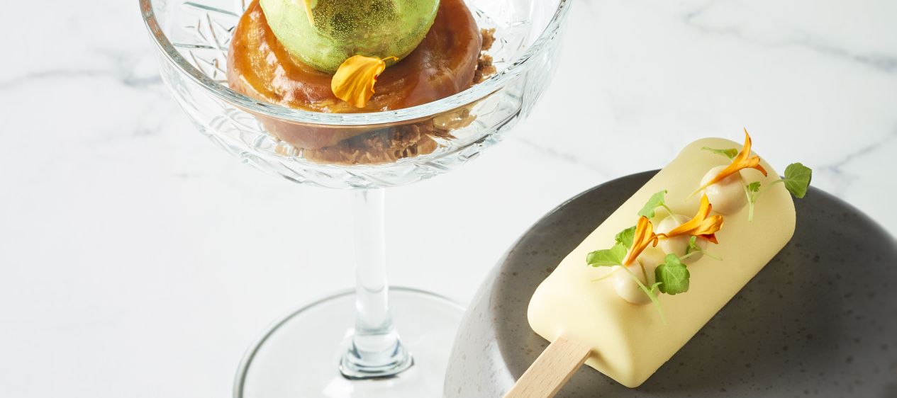 Suikerbol gevuld met espuma van pastinaak, gecarameliseerde appel en pastinaakijs.