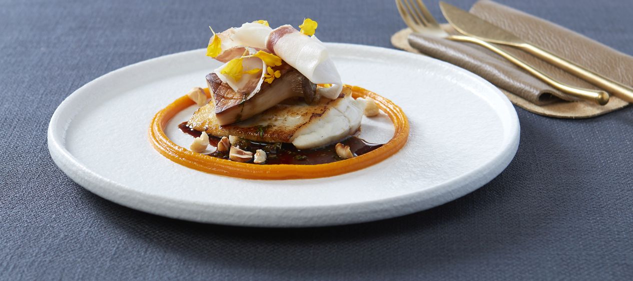 Tarbot in combinatie met winterse groenten, een mooie jus én lardo; dat is echt heel lekker!