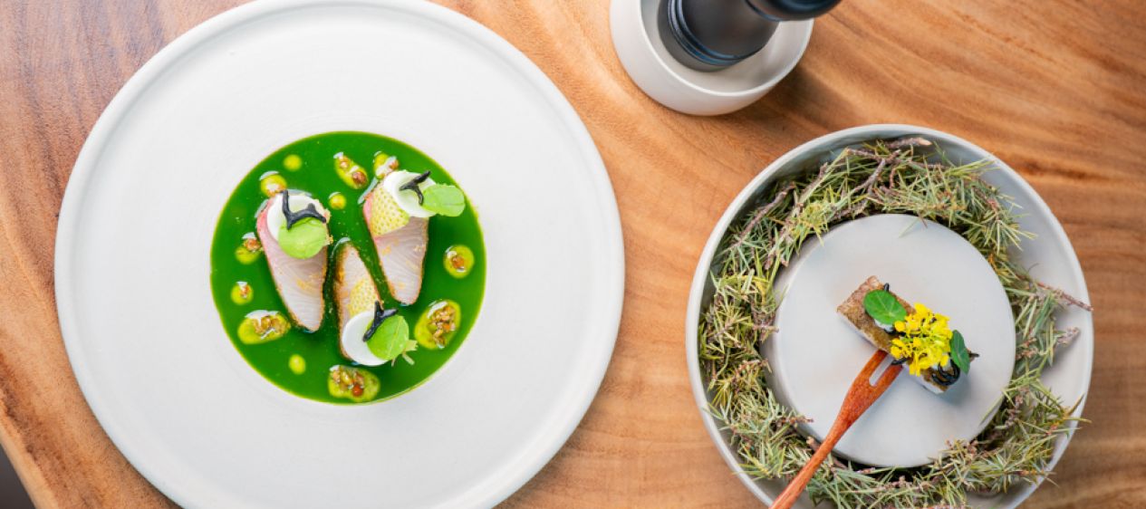 • Dresseer de groene bouillon in een mooi diep rond bord en plaats de plakjes Yellowtail kingfish in het midden.