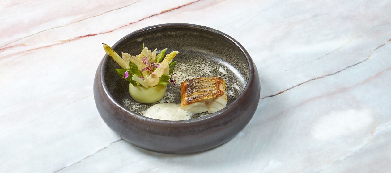 Recept gemaakt door Kars van Wechem van Restaurant De Saffraan in Amersfoort. Zeebaars Bombe Lavas • asperges • krokante kippenhuid • gebakken gist