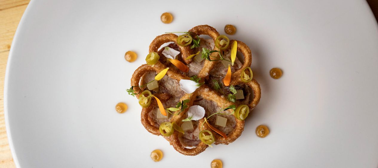 Bij La Tasquería staat orgaanvlees centraal—van lams- en eendentong tot hanenkammen en het hoofd van een speenvarken—bereid met precisie en creativiteit. De à la carte kaart en drie verschillende tasting menu’s zijn gemaakt om te delen, met zowel verrassingen als herkenbare comfortgerechten. Er is altijd iets buiten de kaart: denk aan confit van speenvarkenhoofd of een taco van varkenswang met carabinero. Elk gerecht getuigt van respect voor het product en het proces. Voor wie iets minder avontuurlijk is, staan er ook andere opties op de kaart, maar de magie zit in de ontdekking van hoe verfijnd casquería kan zijn.